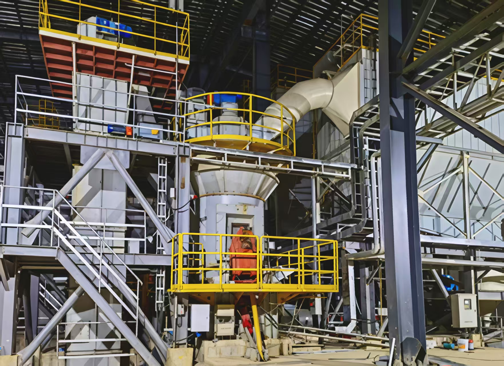 Tire rollers and arc-shaped grinding discs are adopted, enabling adaptation to the grinding of dry, wet, hard and soft materials. The roller sleeves can be reversed for use and have a long service life; the grinding roller door applies unique mechanical sealing or rubber sealing technology (in the coal grinding industry), requiring no sealing fan and being economical and practical; it is equipped with independent maintenance oil cylinders that can flip the grinding rollers out of the machine, facilitating maintenance and replacement; static, large-blade and airfoil dynamic-static powder separators are designed to meet the separation requirements of powder products with various fineness, and the finished product fineness is conveniently adjustable with good uniformity; the mill is provided with a limit protection device to prevent damage caused by rigid contact between the rollers and the disc; the system features high automation, allowing remote control of the entire line operation through the central control system.